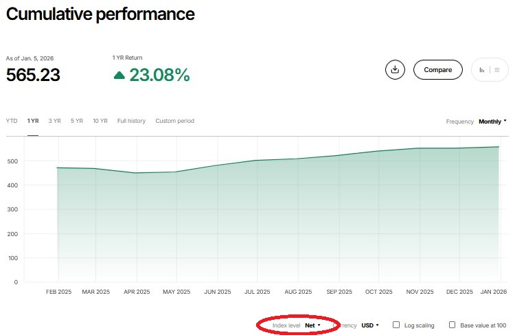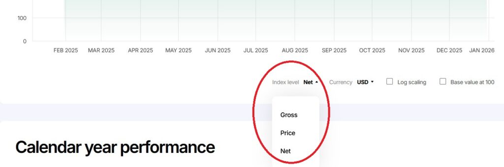 MSCIの「Performance」タブで選べる Index level は、同じACWIでも別物です。