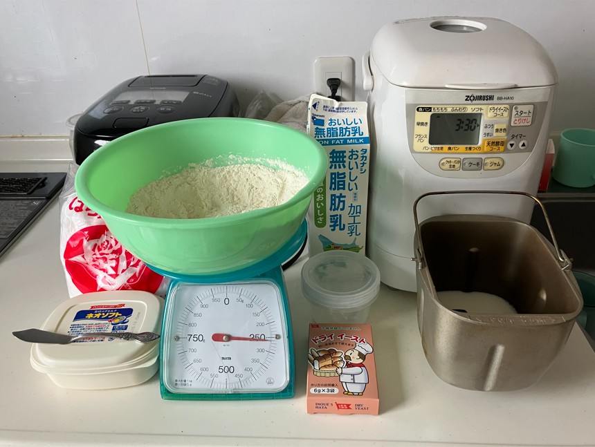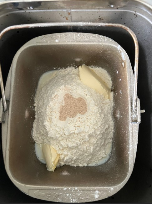 牛乳→ボウルの中身→マーガリン→ドライイースト